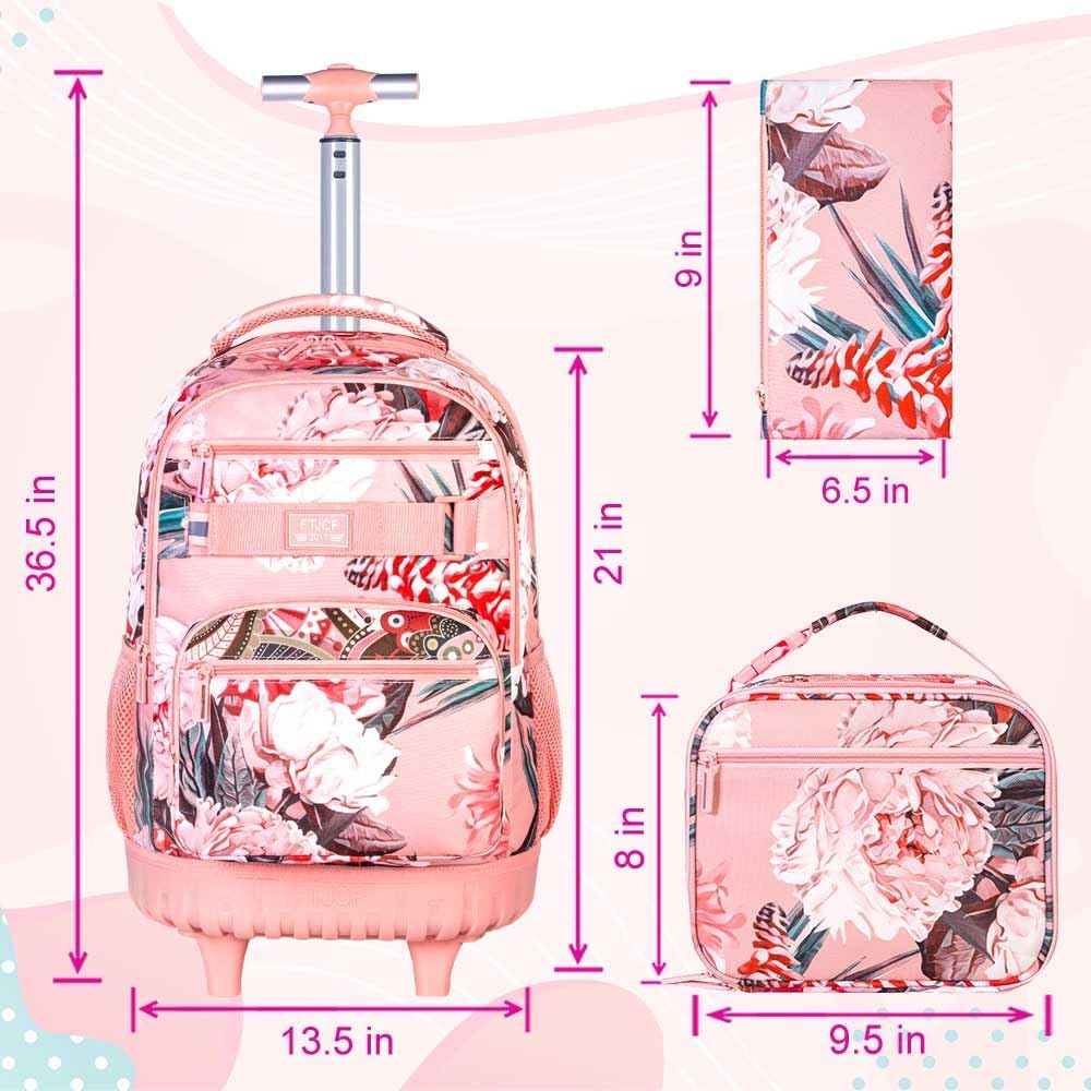 Rolling Backpacks Set: 3-in-1 design, rolling backpack for women (19"x13"x8"Inche) + lunch box (10"x10"x3"Inche)+ penil bag, reasonable combination to meet the needs of boys of different ages. Unique Wheel Backpack: The stylish front buckle design with pink flowers print, allows you to hang hats or dolls. Available in a variety of colours, this rolling backpack is a great gift idea.